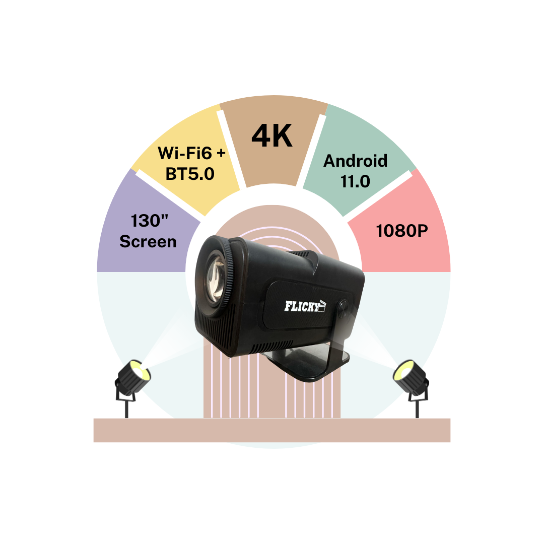 Elevate your entertainment with the Flicky projector, offering a stunning 130"-220" display, 1080P resolution, and 4K decoding for vivid, lifelike visuals.